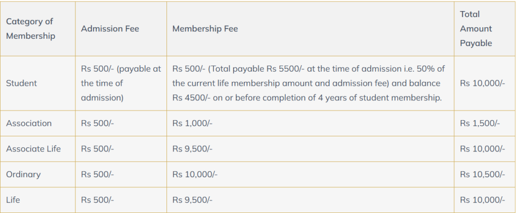 | Student | Rs 500/- (payable at the time of admission) | Rs 500/- (Total payable Rs 5500/- at the time of admission i.e. 50% of the current life membership amount and admission fee) and balance Rs 4500/- on or before completion of 4 years of student membership. | Rs 10,000/- |